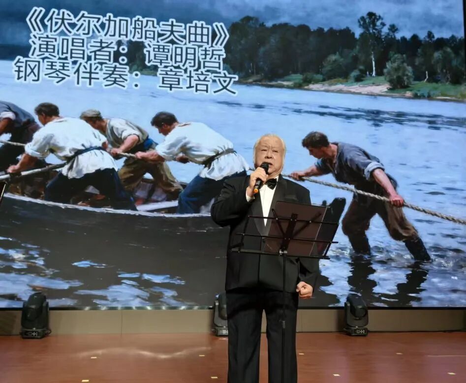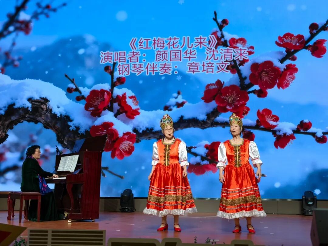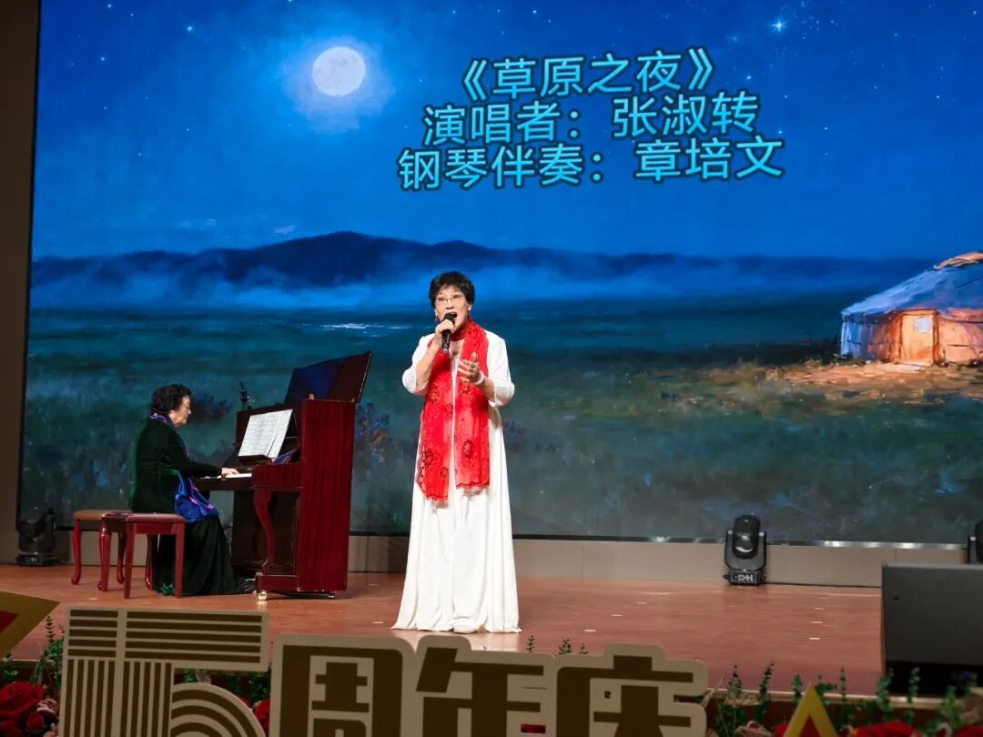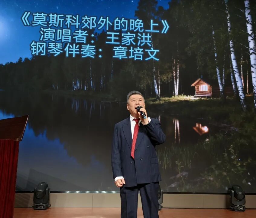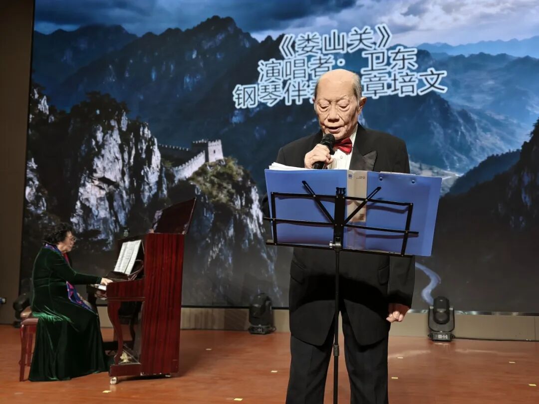 顏國華與沈清來老師合作的《紅莓花兒開》溫婉和暢,雙聲交融中盡顯默契與韻致;姜敏與竺士文老師則以四手聯彈呈現《彩云追月》的悠遠意境與《匈牙利舞曲》的明快節奏,指尖流轉間,音樂如月光般灑滿全場。王家洪老師演唱的《莫斯科郊外的晚上》重溫經典,喚起幾代人的集體記憶;顏國華老師獻唱的《多情的土地》,以其深情的詠嘆道出對家國的眷戀;而原中央樂團國家一級演員衛東老師演繹的《婁山關》,則以磅礴氣勢展現了革命精神與藝術生命力的交響共鳴。
