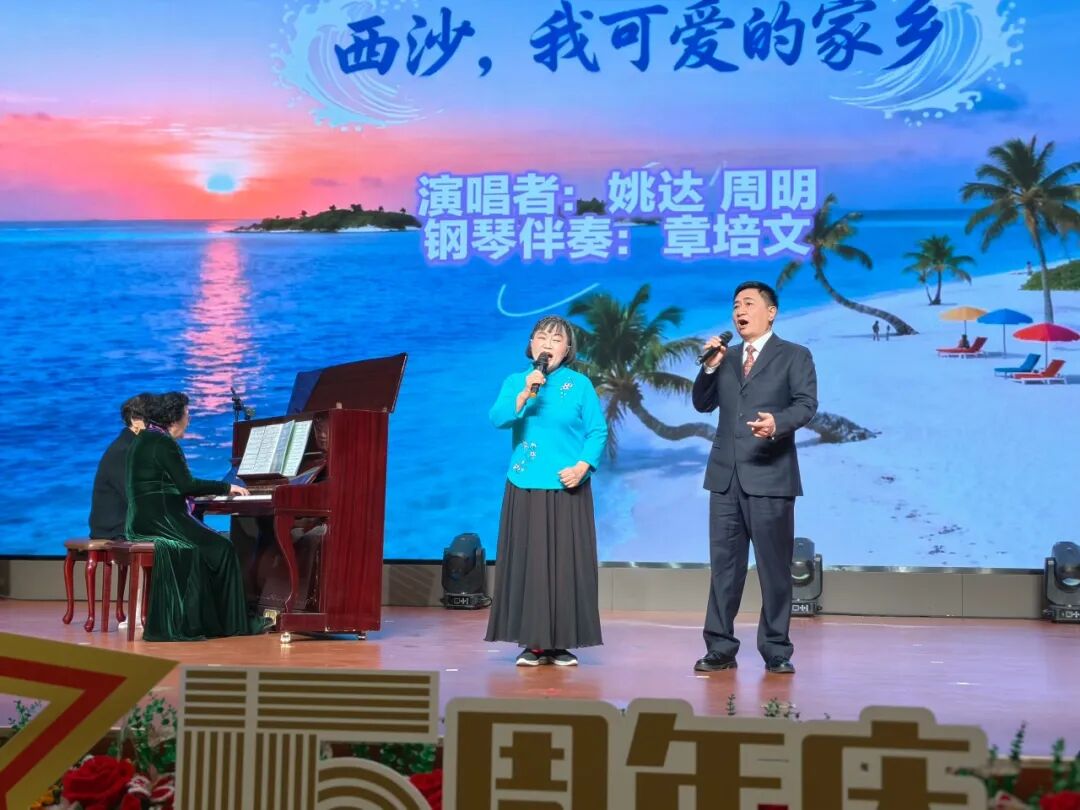 周明老師不僅以蘇州評彈《蝶戀花·答李淑一》展現江南雅韻的細膩婉轉,更與姚達老師共唱《西沙,我可愛的家鄉》,歌聲里流淌著真摯深沉的家國情懷;姚達老師則獨唱《有一個美麗的傳說》的深情訴說,每段旋律都承載著生命沉淀的溫度。