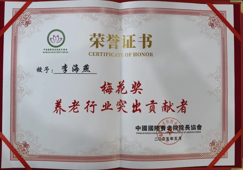 2025年5月5日,中國國際養老院院長協會授予燕達國際健康城副總裁李海燕女士“梅花獎 養老行業突出貢獻者”稱號。